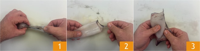 Para preparar la fregola con mariscos, lo primero que debes hacer es dedicarte a la limpieza de los calamares. Enjuágalos bajo agua corriente, separa la cabeza con los tentáculos del manto 1 y extrae la pluma de cartílago del manto 2. Elimina la piel del manto 3.