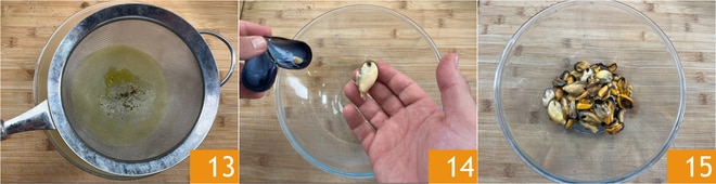 Filtra el fondo de cocción 13 y reserva. Separa la carne de la concha 14 15, pero guarda algunas conchas para la presentación.