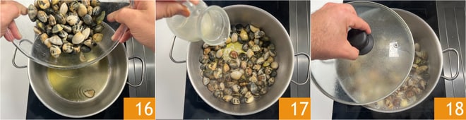 Ahora dedícate a la limpieza de las almejas. Pon las almejas en remojo, asegúrate de que no haya almejas muertas o rotas que puedan soltar arena, luego enjuaga cuidadosamente. En una olla vierte el aceite, añade el ajo y deja dorar durante unos minutos. Añade las almejas 16 y rocía con vino blanco 17, deja evaporar toda la parte alcohólica y cubre con una tapa 18. Cocina hasta que las almejas se hayan abierto.