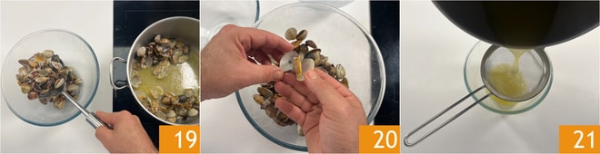 Transfiérelas a un bol 19 y separa la carne de la concha 20, también en este caso guarda algunas conchas para la presentación. Filtra el fondo de cocción de las almejas 21.