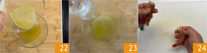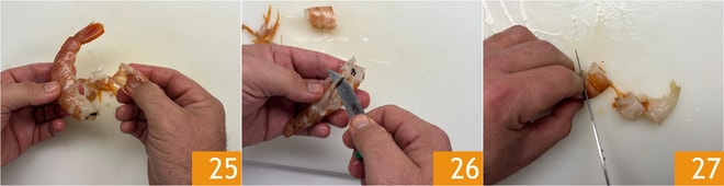 Elimina el caparazón 25, luego haz un corte en el lomo de los crustáceos y elimina también el intestino 26. Córtalos en trozos de aproximadamente 1 cm de longitud 27.