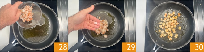 En una sartén calienta el aceite y añade los langostinos 28, ajusta de sal 29, déjalos dorar durante unos 5 minutos 30 y transfiérelos a un bol.