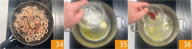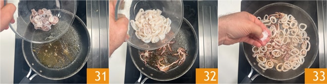 En la misma sartén calienta un poco de aceite, luego pon los tentáculos de los calamares 31 y dóralos durante 5 minutos. Añade también los mantos cortados en anillos 32 y ajusta de sal 33.