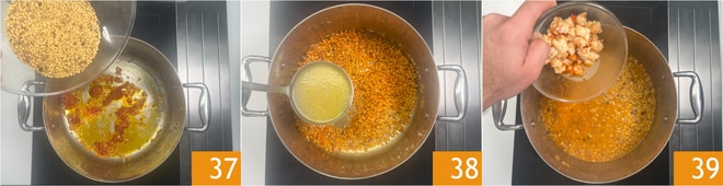 Añade la fregola 37 y deja tostar durante 3 minutos. Vierte en la olla 3 cucharones de fondo de cocción de mejillones y almejas 38, cocina hasta que los líquidos hayan sido absorbidos por la fregola. Luego continúa añadiendo más líquido hasta que esté cocida, solo en este punto añade los langostinos 39.