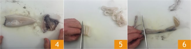 Cuando el manto esté limpio 4, enjuaga cuidadosamente tanto el exterior como el interior. Luego córtalo en anillos de aproximadamente 2 cm. 5. Retoma las cabezas y separa los tentáculos de la cabeza cortando justo debajo de los ojos 6.