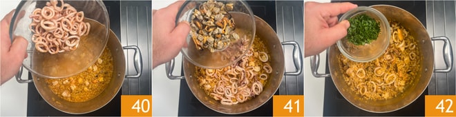 Añade también los calamares 40, los mejillones y las almejas 41. Por último, añade el perejil picado 42.