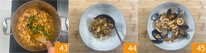 Mezcla para integrar todos los ingredientes 43, luego emplata 44 añadiendo algunas conchas de mejillones y almejas. Tu fregola con mariscos está lista para ser servida 45.