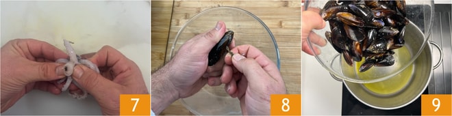 Abre los tentáculos hacia afuera y con las manos empuja la parte central, luego elimina el diente 7. Enjuaga bajo agua corriente. Luego dedica al Cómo limpiar y abrir los mejillones. Raspa la concha, con el dorso de un cuchillo o con un estropajo, para eliminar todas las impurezas. Luego tira el biso 8, enjuaga bajo agua corriente hasta que el agua salga limpia. En una olla calienta el aceite, luego añade los mejillones 9 y mezcla.