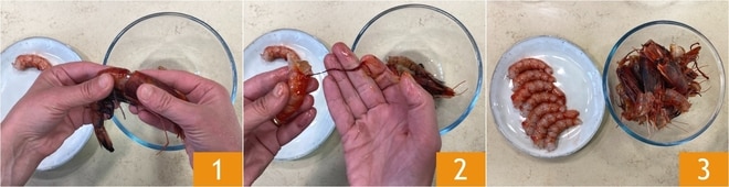 Para preparar la fregola con gambas, stracciatella y regaliz, primero ocúpate de limpiar las gambas rojas: separa la cabeza del cuerpo 1 y conserva las cabezas. Retira el caparazón, la cola y las patas, luego haz un corte en la parte dorsal con la punta de un cuchillo y elimina el intestino 2. Guarda las gambas limpias en el frigorífico y reserva las cabezas 3.