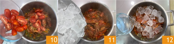 A continuación, añade los tomates cherry cortados por la mitad 10 y mezcla. Vierte el hielo 11 y cubre con agua 12.