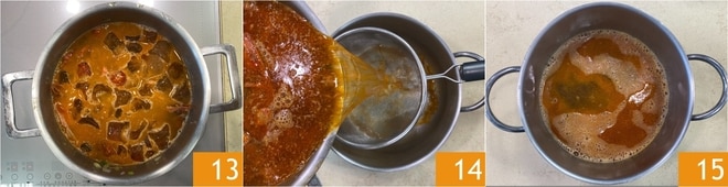 Baja el fuego y deja cocinar durante 40 minutos 13. Transcurrido este tiempo, filtra el caldo 14 y mantén el líquido obtenido caliente 15.