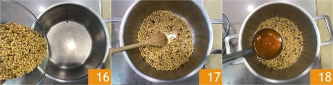 Vierte la fregola en una cacerola 16 y tuéstala en seco, mezclando continuamente 17. Cuando al tocar la fregola con las manos sientas que está caliente añade un cucharón de caldo 18. Continúa la cocción de este modo, asegurándote de esperar a que el líquido se haya absorbido antes de verter más; tardará unos 12 minutos.