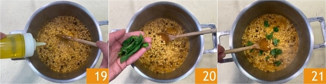 Una vez que la fregola esté cocida, apaga el fuego y añade un chorrito de aceite 19, luego perfuma con unas hojitas de albahaca rotas con las manos 20. Mezcla bien 21.