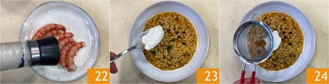 Deja reposar la fregola y mientras tanto condimenta las gambas crudas con aceite y sal 22. Estás listo para emplatar: adorna la fregola con un poco de stracciatella 23, luego espolvorea con polvo de regaliz 24.