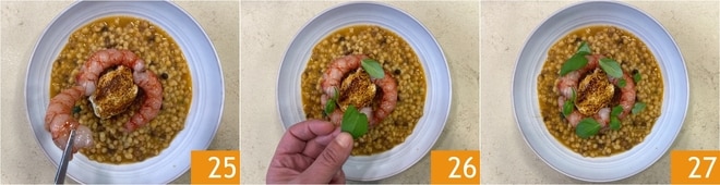 Finalmente, añade las gambas crudas 25 y algunas hojitas de albahaca 26. ¡Tu fregola con gambas, stracciatella y regaliz está lista para ser servida 27!