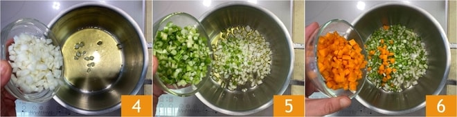 Pasa al fondo de cocción: calienta un chorrito de aceite en una cacerola, luego añade la cebolla 4, el apio 5 y las zanahorias 6 que habrás cortado previamente en trozos grandes.