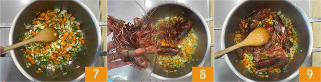 Dora las verduras mezclando a menudo 7, luego añade las cabezas de las gambas 8. Continúa dorando durante unos minutos aplastando las cabezas con el cucharón para sacar todos los jugos 9.