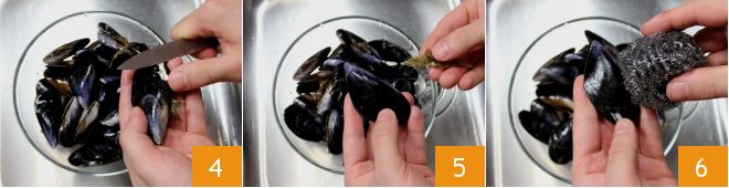Pasa entonces a los mejillones (puedes consultar la guía de la Escuela de cocina: cómo limpiar los mejillones para seguir el proceso paso a paso). Lava los mejillones bajo agua corriente, luego con el dorso de la hoja de un cuchillo elimina todas las incrustaciones y los crustáceos 4 (parásitos, de color blanco o gris, que se forman en la concha) y, con un movimiento enérgico, arranca manualmente la barba, o biso, que sale de las valvas 5. Siempre bajo el agua fresca corriente y utilizando un estropajo de acero (o un cepillo rígido), frota enérgicamente los mejillones para eliminar cualquier impureza 6.