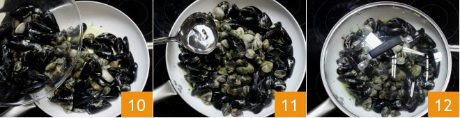 Agrega los mejillones y las almejas (previamente enjuagados para quitar la salinidad del agua salada) 10, rocíalos con 3 cucharones de agua 11 y cúbrelos con una tapa 12. Cocina hasta que se abran completamente las valvas.