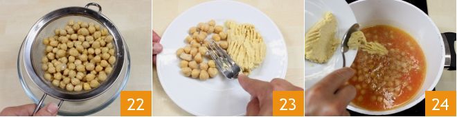 Pasado el tiempo indicado, dejando el fuego encendido, toma de la cacerola dos cucharadas de garbanzos 22, colócalos en un plato y aplástalos con un tenedor 23 para obtener un puré. Luego vierte el puré obtenido en la cacerola con el resto de los garbanzos en cocción 24 y deja espesar. Mezcla y cocina durante unos minutos más.