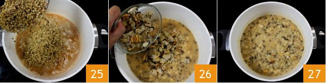 Agrega también la fregola a los garbanzos 25, mezcla y cocina a fuego lento añadiendo poco a poco algunos cucharones de caldo. Luego vierte también los mejillones y las almejas que habías pelado 26, cocina durante 4-5 minutos más, hasta que la preparación haya alcanzado la consistencia de una sopa espesa. Ajusta de sal y pimienta al gusto, luego apaga el fuego y tu fregola con mejillones, almejas y garbanzos estará lista para servirse 27!