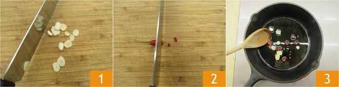 Para preparar los friarielli y huevos en sartén, empezad con el sofrito: cortad en láminas finas un diente de ajo pelado 1 y una guindilla fresca 2. Verted un chorro abundante de aceite en una sartén antiadherente o de hierro fundido y dejad sofreír el ajo y la guindilla a fuego bajo por unos minutos 3.