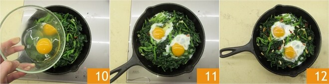 En cuanto los friarielli estén cocidos, extendedlos ligeramente para crear dos cavidades donde verter los huevos 10. Dejadlos cocinar unos minutos hasta que la clara esté bien cocida, mientras que la yema debe permanecer blanda 11. Verted los piñones y condimentad con sal y pimienta si queréis. Vuestros huevos están listos, servidlos bien calientes 12.