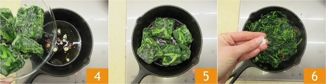 Añadid los friarielli directamente congelados 4 y dejadlos estofar, subiendo ligeramente el fuego 5. En cuanto se hayan descongelado, añadid una pizca de sal 6.