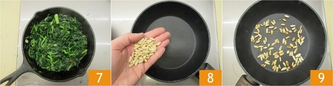 Terminad la cocción de los friarielli 7 y mientras tanto verted los piñones en una sartén pequeña 8 para tostarlos 9.