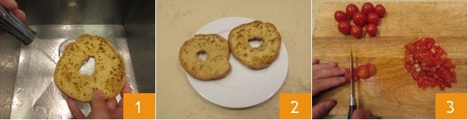 Para preparar las friselle con tomate y anchoas, lo primero que hay que hacer es humedecer las friselle con agua fría 1, y colocarlas en un plato 2. Laven los tomatitos bajo el agua corriente y córtenlos en pequeños trozos 3.