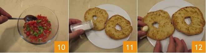 Mezclen bien para amalgamar todos los ingredientes 10 y reserven. Salen ligeramente sus friselle 11 y frótenlas con la parte restante del ajo 12.