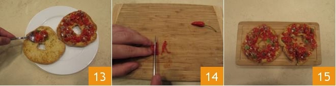 En este punto, coloquen la ensalada de tomate y anchoas sobre las friselle, ayudándose con una cuchara 13. Eliminen las semillas internas del chile, córtenlo en tiras 14 y colóquenlo sobre las friselle con tomatitos y anchoas 15.