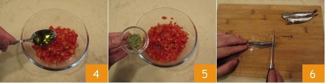Viértan los tomatitos recién cortados en un bol y condiméntelos con aceite 4, sal, orégano 5 y pimienta negra. Corten las Boquerones en vinagre en pequeños trozos 6,