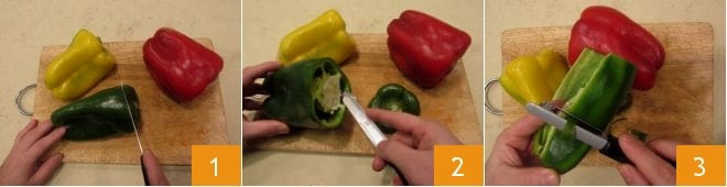 Para preparar la tortilla de patatas y pimientos, empiece colocando al fuego una olla con abundante agua que necesitará para el Caldo de verduras. Continúe con la limpieza de los pimientos: lave bien los pimientos bajo abundante agua fría corriente y séquelos con papel absorbente. Elimine la parte superior 1, luego con un cuchillo quite los filamentos blancos y las semillas que se encuentran en el interior 2; con un pelador elimine la piel 3.