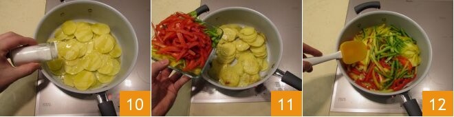 Agregue las patatas cortadas en rodajas, ajustando de sal 10 y pimienta, y cocine a fuego medio durante 3-4 minutos. A continuación, añada los pimientos en tiras 11 y cocine durante otros 7-8 minutos, removiendo con una espátula 12.