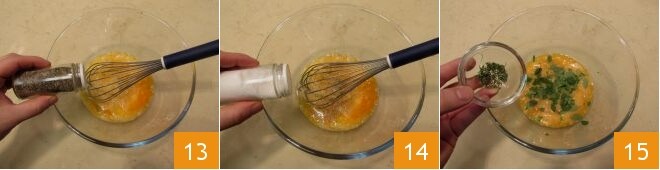 En un bol aparte bata los huevos sazonando con sal y pimienta (13-14), mejorana y tomillo 15;