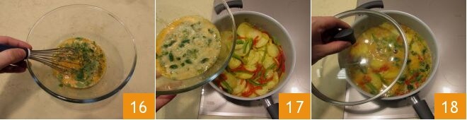 mezcle todo con las varillas para amalgamar bien los ingredientes 16. Cuando las verduras estén listas, añada los huevos batidos 17 y continúe la cocción durante 10 minutos a fuego lento, cubriendo con una tapa 18.