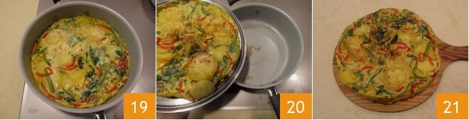 Transcurrido el tiempo necesario 19, con la ayuda de la tapa, voltee la tortilla 20 y cocínela durante 2-3 minutos del otro lado. Una vez lista, podrá servir y disfrutar de su tortilla de patatas y pimientos 21.