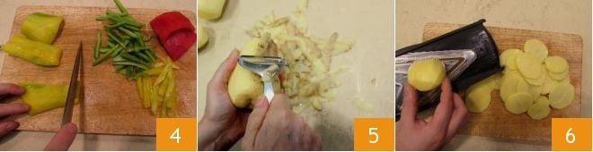 Luego, córtelos en tiras de un grosor de 0,5 cm 4. Pele las patatas 5 y con una mandolina obtenga rodajas de 2-3 mm de grosor 6.