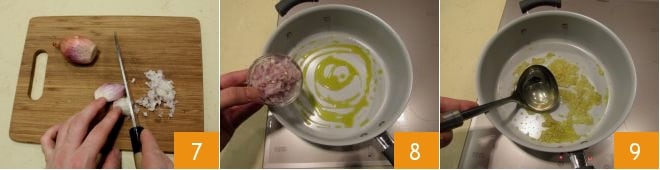 Pique finamente el chalote 7, sofríalo en una sartén grande antiadherente con aceite 8, luego agregue el caldo de verduras caliente 9.