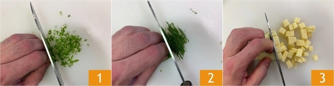 Para preparar la tortilla de requesón, primero picad finamente el cebollino 1 y la menta 2, luego cortad la provola en cubitos 3.