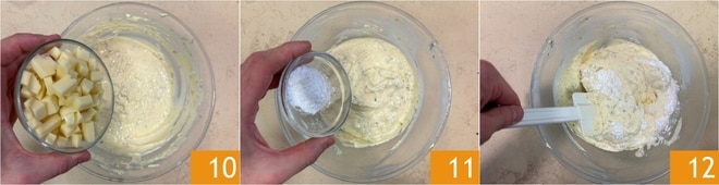 Finalmente, incorpora la provola en cubitos 10, la levadura instantánea 11 y mezcla de nuevo para integrar todo 12.
