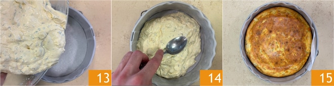 Vierte la mezcla en un molde de 18-20 cm de diámetro forrado con papel de horno 13 y nivela la superficie 14. Hornea en un horno estático precalentado a 170° durante unos 35 minutos. Una vez cocida y dorada, saca la tortilla de requesón del horno y déjala enfriar en el molde 15 antes de desmoldarla y servirla.