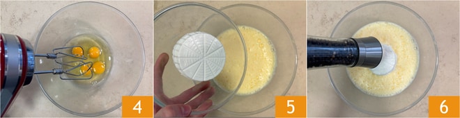 Casca los huevos en un bol grande y bátelos con las varillas eléctricas 4. Cuando obtengas una mezcla clara y espumosa, añade el requesón 5, sal y pimienta 6.