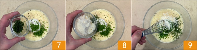 Agrega también las hierbas aromáticas picadas 7 y el Parmesano rallado 8, luego mezcla bien con unas varillas 9.