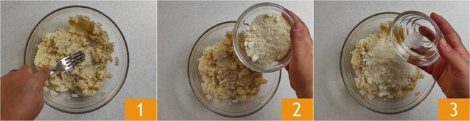 Para preparar los buñuelos de coliflor, lo primero que debéis hacer es poner las florecillas cocidas al vapor en un bol y machacarlas con un tenedor 1. Luego, añadid el Parmesano 2 y la sal 3.