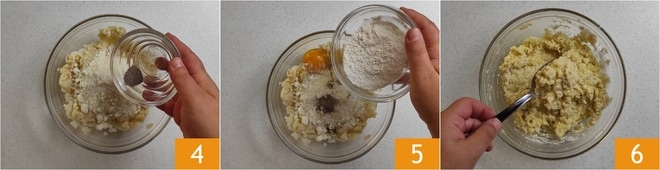 Añadid la pimienta 4, los huevos, la harina 5 y amasad hasta obtener una mezcla homogénea 6.