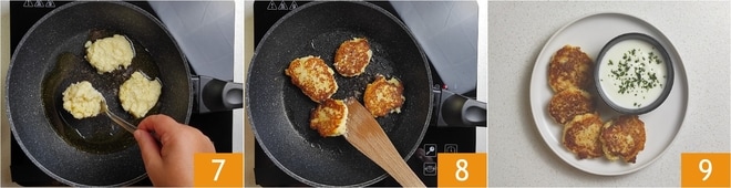 En una sartén antiadherente, calentad el aceite, coged 3-4 cucharadas de la mezcla, ponedlas en la sartén 7 y cocinad a fuego medio durante 2 minutos por cada lado o hasta que estén doradas 8. Los buñuelos de coliflor están listos para servirse, tal vez acompañados de una salsa de yogur 9.