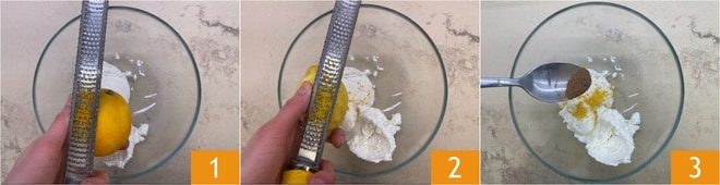 Para preparar los buñuelos de ricotta dulces, primero pon la ricotta en un bol, luego añade la ralladura de la naranja 1, la del limón 2 y la canela 3.