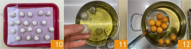 Coloca las bolitas en una bandeja cubierta con papel de horno 10. Calienta el aceite de girasol a una temperatura de 160° y fríe pocos buñuelos a la vez para no bajar demasiado la temperatura del aceite 11. Fríe durante 3-4 minutos, hasta que estén dorados, luego escúrrelos con una espumadera 12.